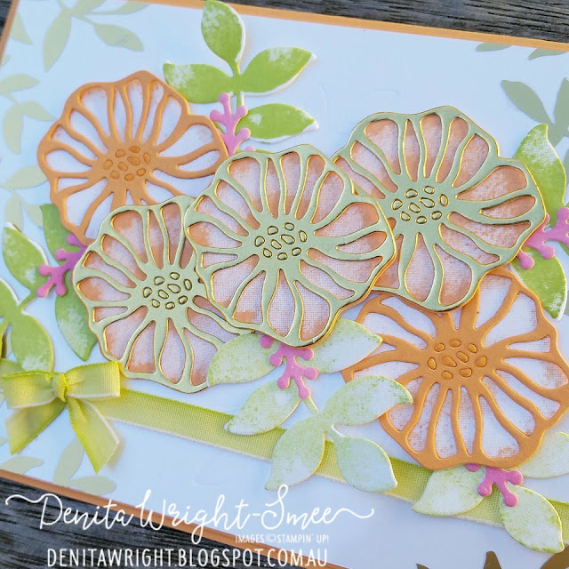 I die-cut the floral flourish using the 'Flourish Thinlits Dies' from 'Watercolor Paper'. I then coloured the flowers, leaves & stems using 'Berry Burst' & 'Wild Wasabi' ink with an 'Aqua Painter'. I used 'Shimmery White' cardstock for the top mat, and I added a light 'Crumb Cake' wash for the background.